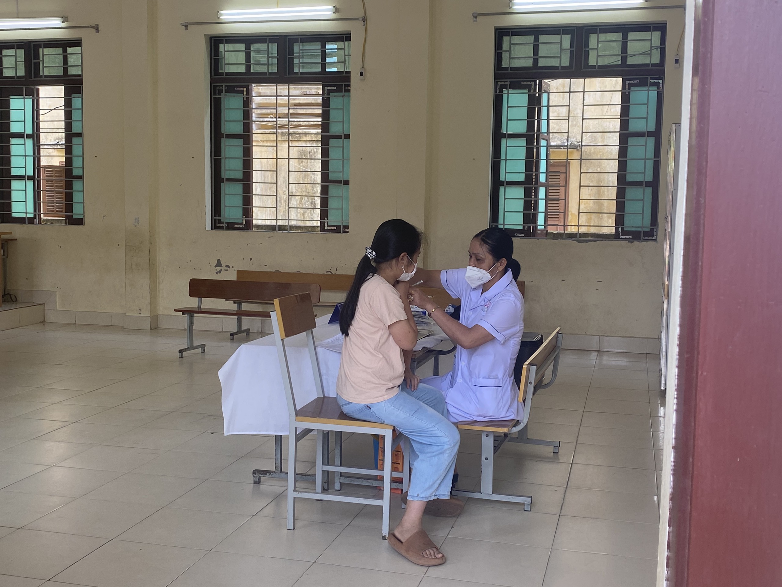Trong quá trình tiêm, có giáo viên đi kèm để giúp các bé bình tĩnh và hợp tác.